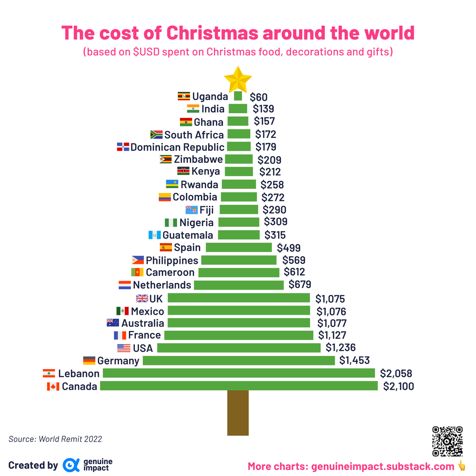 من بين 23 دولة شملها الاستطلاع في عام 2022، من المرجح أن تنفق الاقتصادات النامية مثل الفلبين وأوغندا ونيجيريا أكثر من 100% من إجمالي دخلها الشهري في عيد الميلاد، بينما في المملكة المتحدة، سيكلف عيد الميلاد 65% أكثر مما كان عليه في عام 2021.